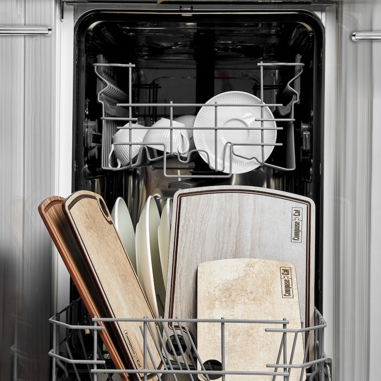 Плотная структура композита бережно относится к ножам, а ухаживать за доской просто — достаточно мыть тёплой водой с мягким средством или в посудомоечной машине на щадящем режиме, а также периодически обрабатывать маслом для поддержания внешнего вида.