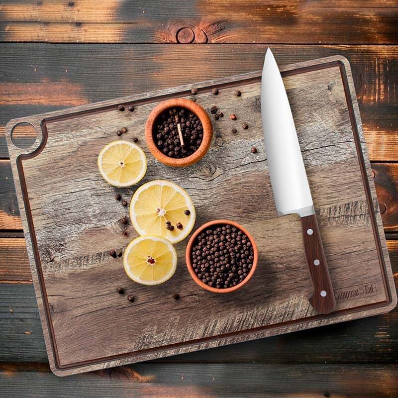 Плотная структура композита бережно относится к ножам, а ухаживать за доской просто — достаточно мыть тёплой водой с мягким средством или в посудомоечной машине на щадящем режиме, а также периодически обрабатывать маслом для поддержания внешнего вида.
