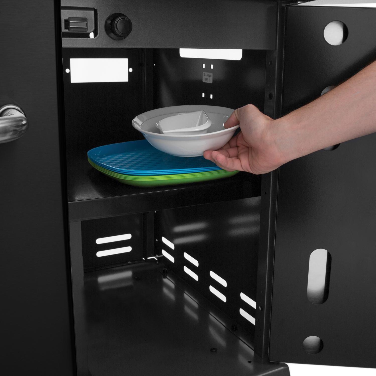 Большие боковые пристолья оснащены вместительными отсеками для бутылочек с соусами, специи; также на них есть крючки для инструментов.
