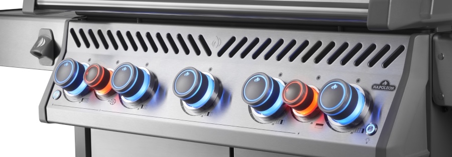 - Эргономичные ручки управления газовыми горелками с подсветкой Safety Glow™ для комфортного приготовления в тёмное время суток (при включении горелки ручка подсвечивается красным цветом, в выключенном состоянии - синим; работает от батареек).