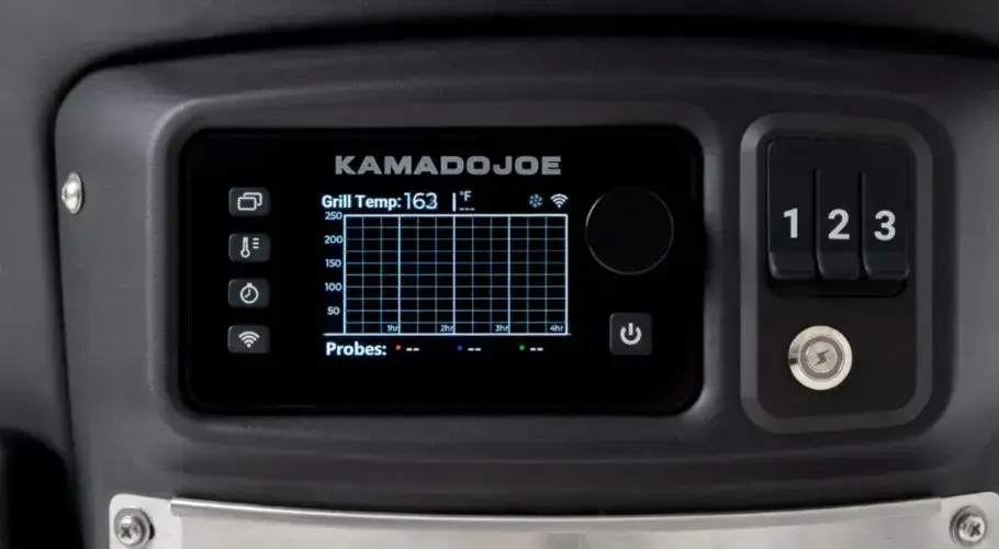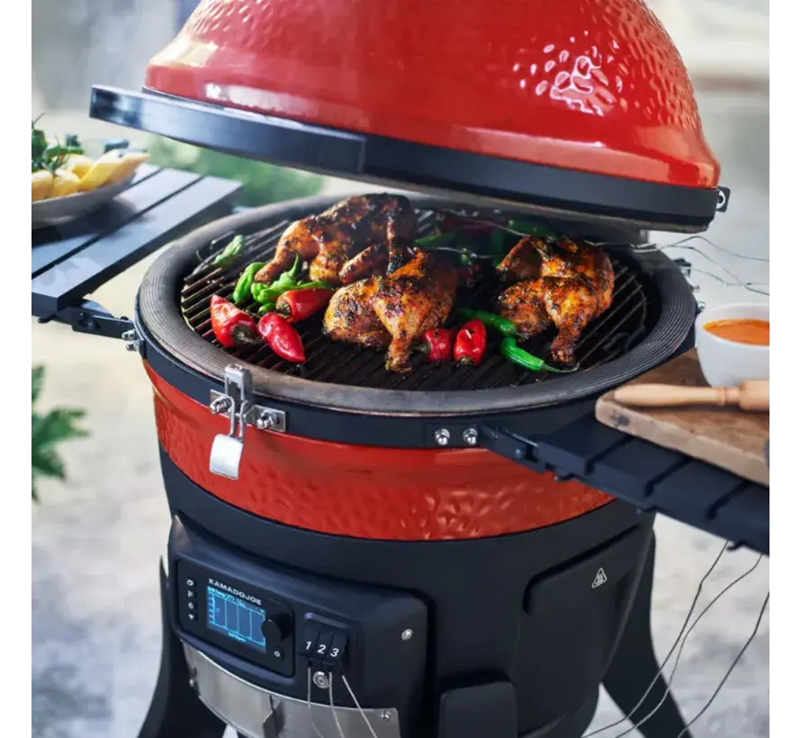 - Цифровая панель управления для настройки разных режимов приготовления, построения графиков температуры. Работает совместно с приложением Kamado Joe для смартфонов.