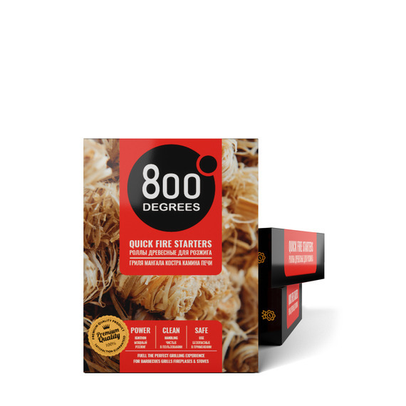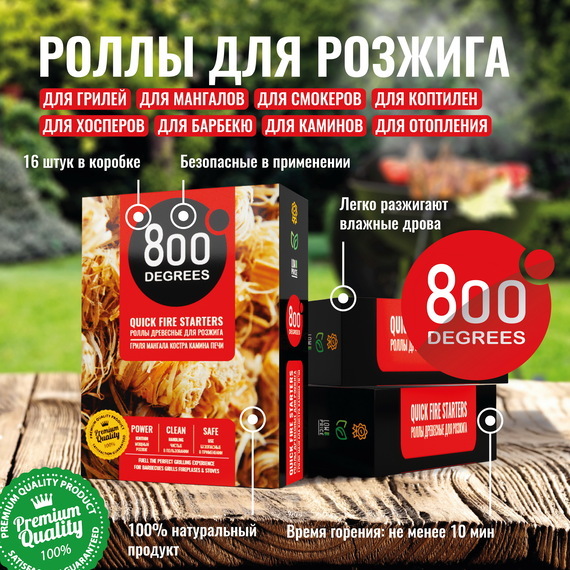 Незаменимый продукт при любой прожарке на мангале или на гриле - древесные роллы 800 Degrees. Нет способа удобнее и чище для розжига любых источников огня. Они легко разжигаются и горят так же, как уголь, они рассчитаны на постоянно высокую теплоотдачу при медленном времени горения. Упакованы в удобные картонные коробки. Производятся по уникальной технологии из древесных стружек и опилок деревьев. Вся продукция рекомендована для приготовления пищи Русским Обществом Барбекю (РОБ) к применению во всех типах угольных и дровяных грилей, хосперах, а также в мангалах, печах и очагах.