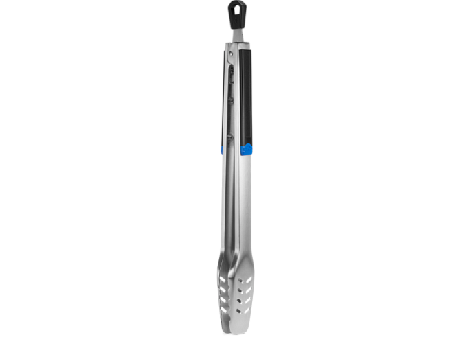 Щипцы выполнены из нержавеющей стали с полимерными, термостойкими, нескользящими ручками. Они легко фиксируются в сложенном состоянии с помощью специального кольца, которое так же служит для их размещения на гриле в вертикальном положении. Этими щипцами легко взять маленькую креветку или перевернуть увесистый стейк при готовке.