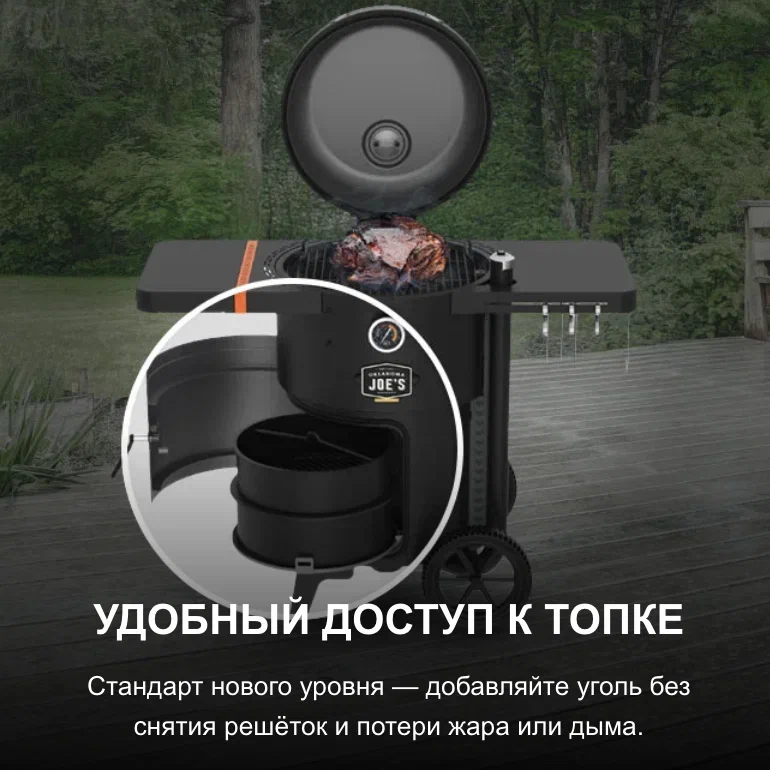 Oklahoma Joe's - культовый американский смокер, не нуждающийся в представлении. Идеальный вариант для любителей готовить барбекю, коптить и жарить. Более 30 лет компания производит коптильни. На этих болидах многократно выигрывались все основные соревнования питмастеров в США и Европе, включая легендарный Jack Daniels World Championship.