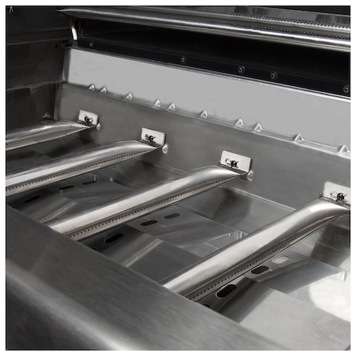 Горелки у Broil King Imperial S 590 BI сделаны по технологии "трубка в трубке", задача которой - обеспечить равномерное распределение жара в духовке. Газ сначала поступает в трубку меньшего диаметра, затем из неё через ряд специальных отверстий - в трубку большего диаметра (в неё вставлена меньшая трубка). Таким образом пламя равномерно выходит в духовку из двух рядов отверстий, который сделаны по всей длине у большой трубки.